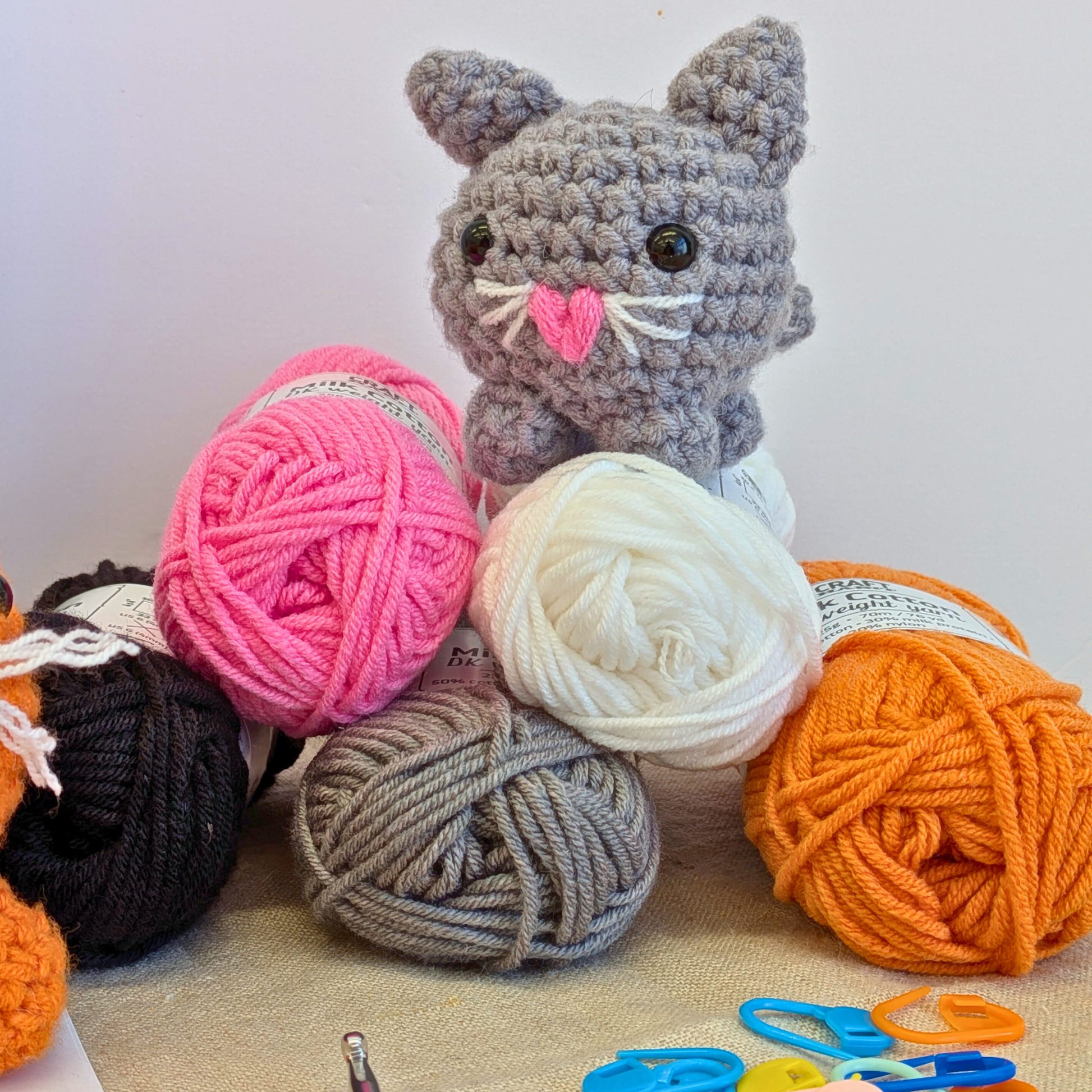 This Cat kit includes 5 mini skeins of milk cotton yarn, 1 oz of polyester fiberfill, an ergonomic crochet hook, stitch markers, a yarn needle, plus any additional notions needed to complete the project, as well as a printed pattern with helpful links.