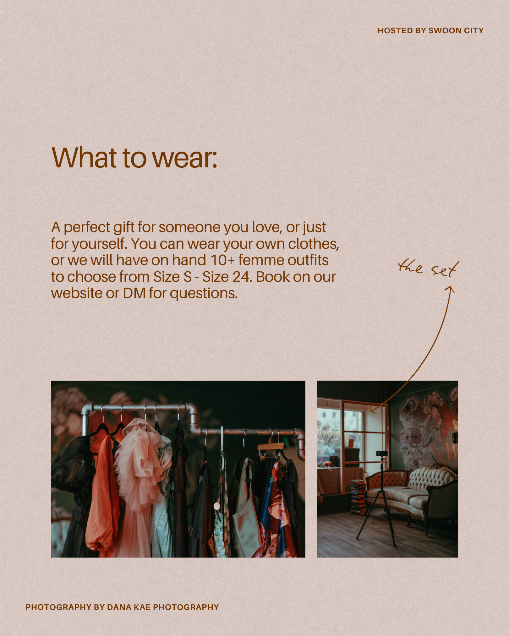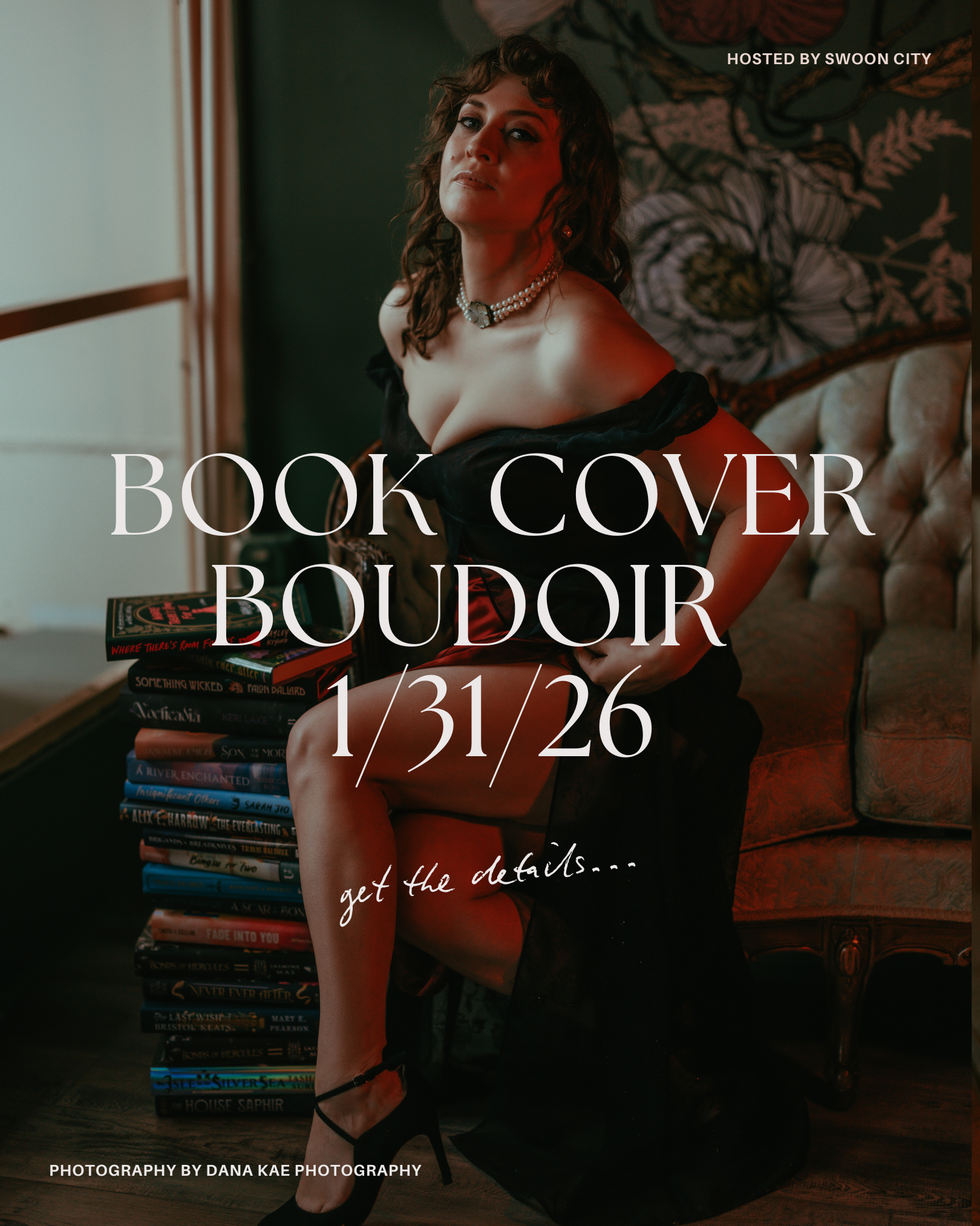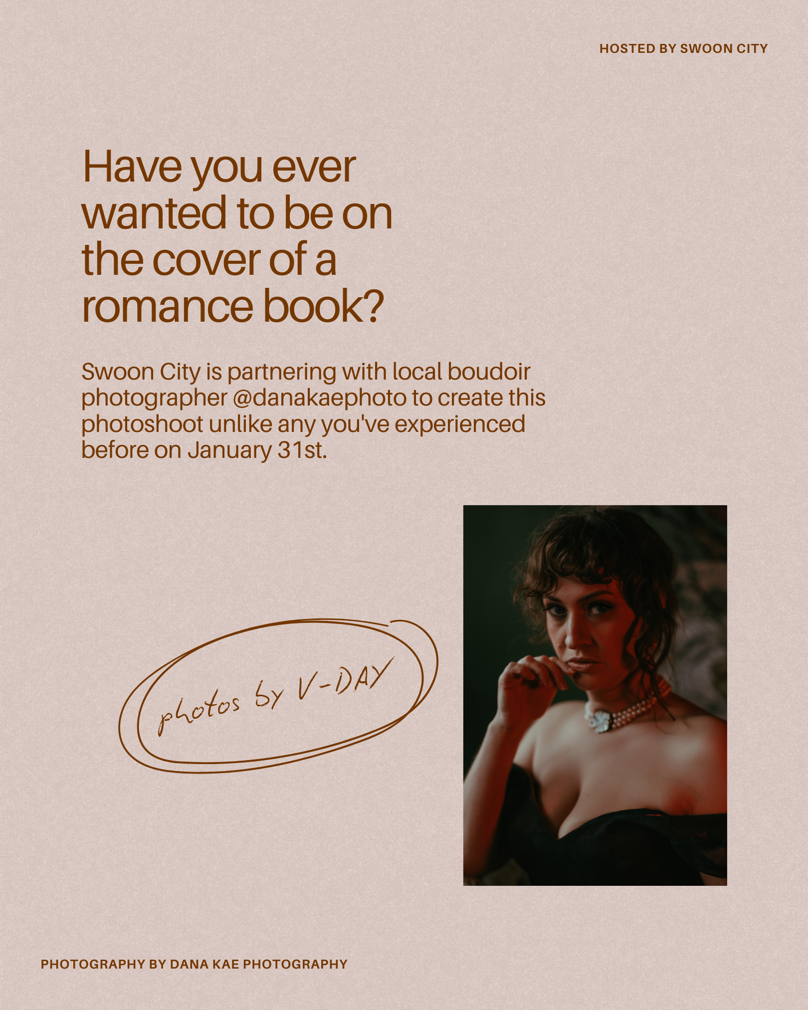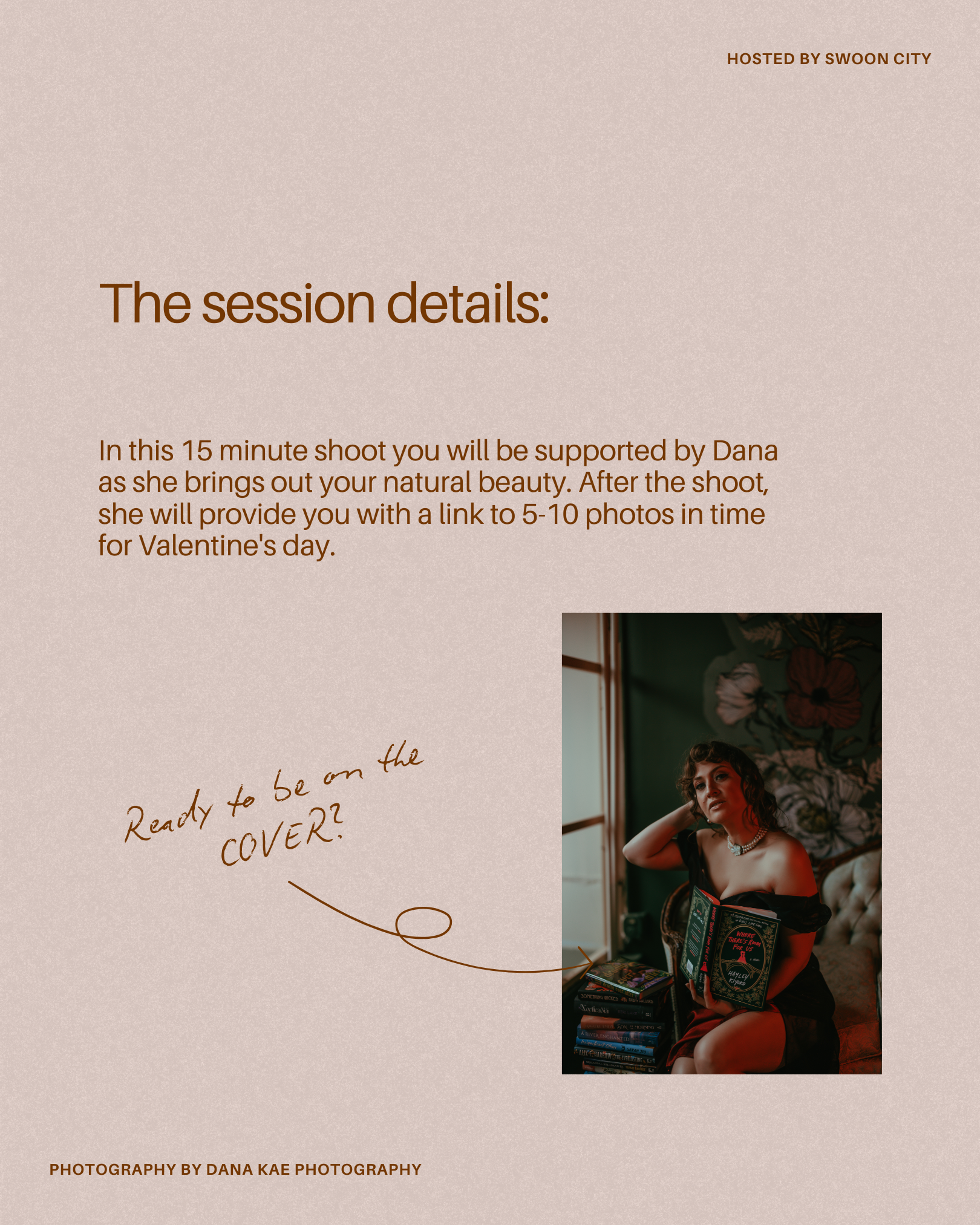 Have you ever wanted to be on the cover of a romance book? Now is your chance to have a romance book cover photoshoot at Swoon City. You will have 15 minutes with professional photographer, Dana Kae to shoot your photos. She will return 5-10 final photos to you before Valentines day. You can select your favorite photo to be turned into a Book Cover. Which you can keep for yourself or gift a loved one. Couples are welcome. You can wear your own clothes, or there will be a selection of 10 dresses on sight Size Small to Size 24.