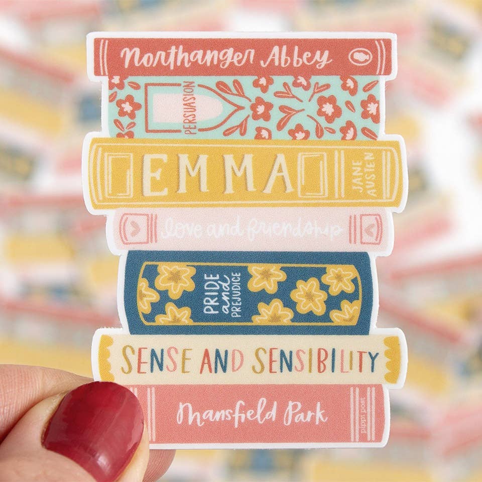 Celebrate the classics with the Book Stack Sticker, featuring a beautifully designed stack of iconic Jane Austen novels. This elegant decal showcases beloved titles like Northanger Abbey, Emma, Pride and Prejudice, and Sense and Sensibility, making it a must-have for fans of timeless literature. This sticker makes a delightful gift for Jane Austen fans, book club members, or anyone who cherishes classic novels.