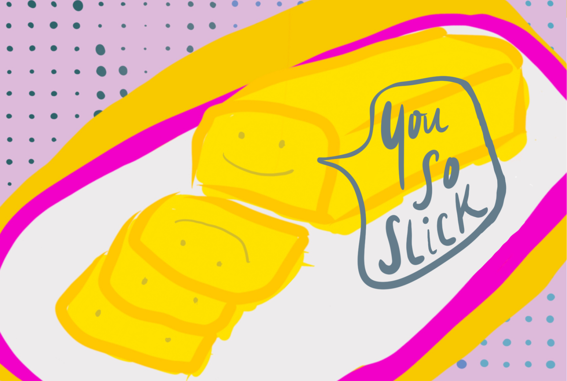 A blank on the inside greeting card by Ugly Baby. The front has a snazzy stick of butter on it and says "YOU SO SLICK."