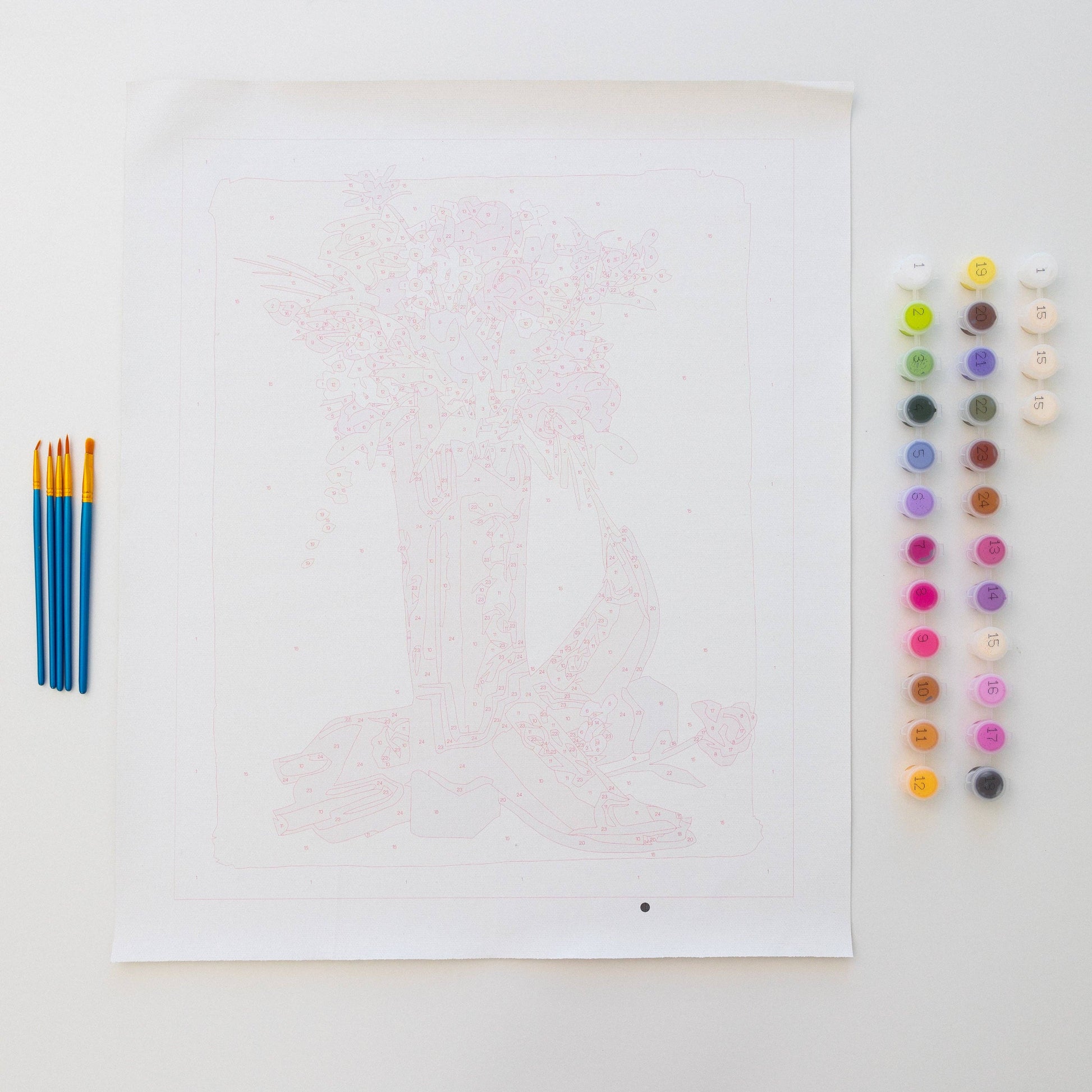 Each kit includes a 16x20 inch printed canvas, a set of 5 premium brushes, and pots of acrylic paint with the appropriate colors with corresponding numbers. Also to make your craft easy and more joyful we have added a small printed finished picture to guide and inspire your painting. Even if you are new to this whole experience still it will be worth every hour spent.