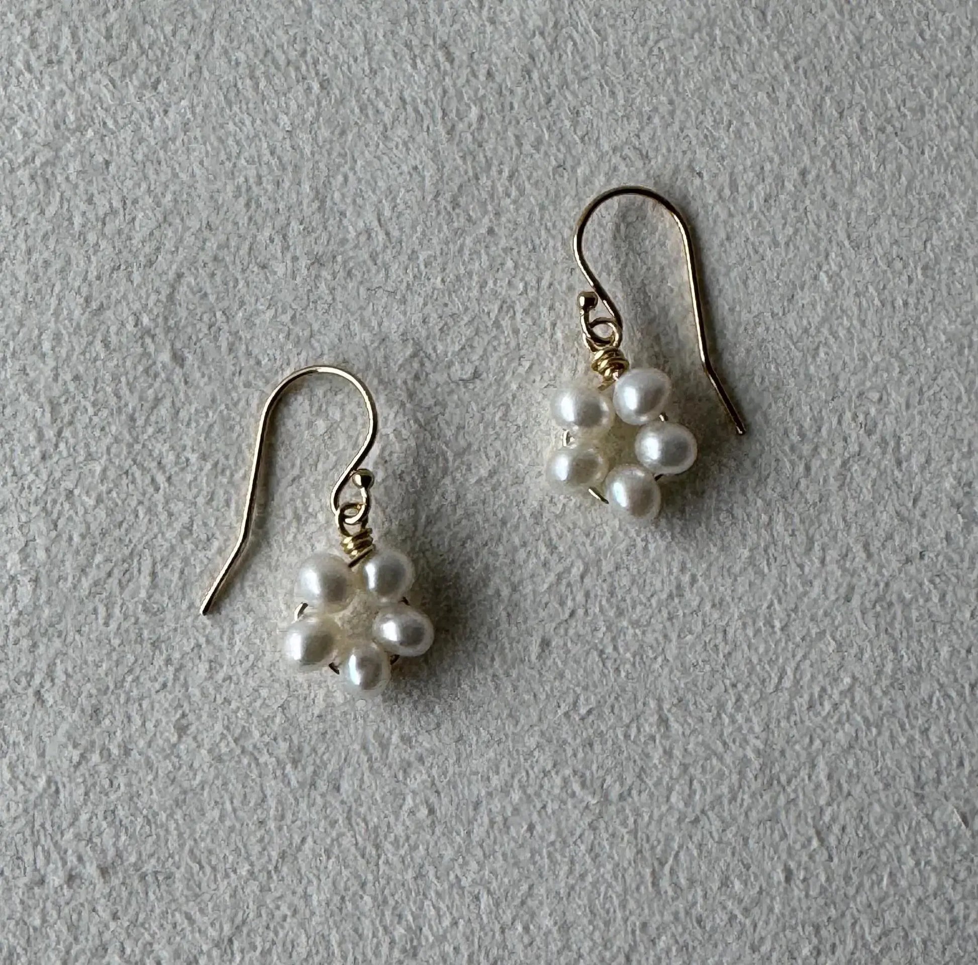 Hand beaded genuine freshwater pearls in the shape of a daisy hang on 14k gold filled or sterling silver earwire. These fun and delicate earrings will surely get people’s attention!