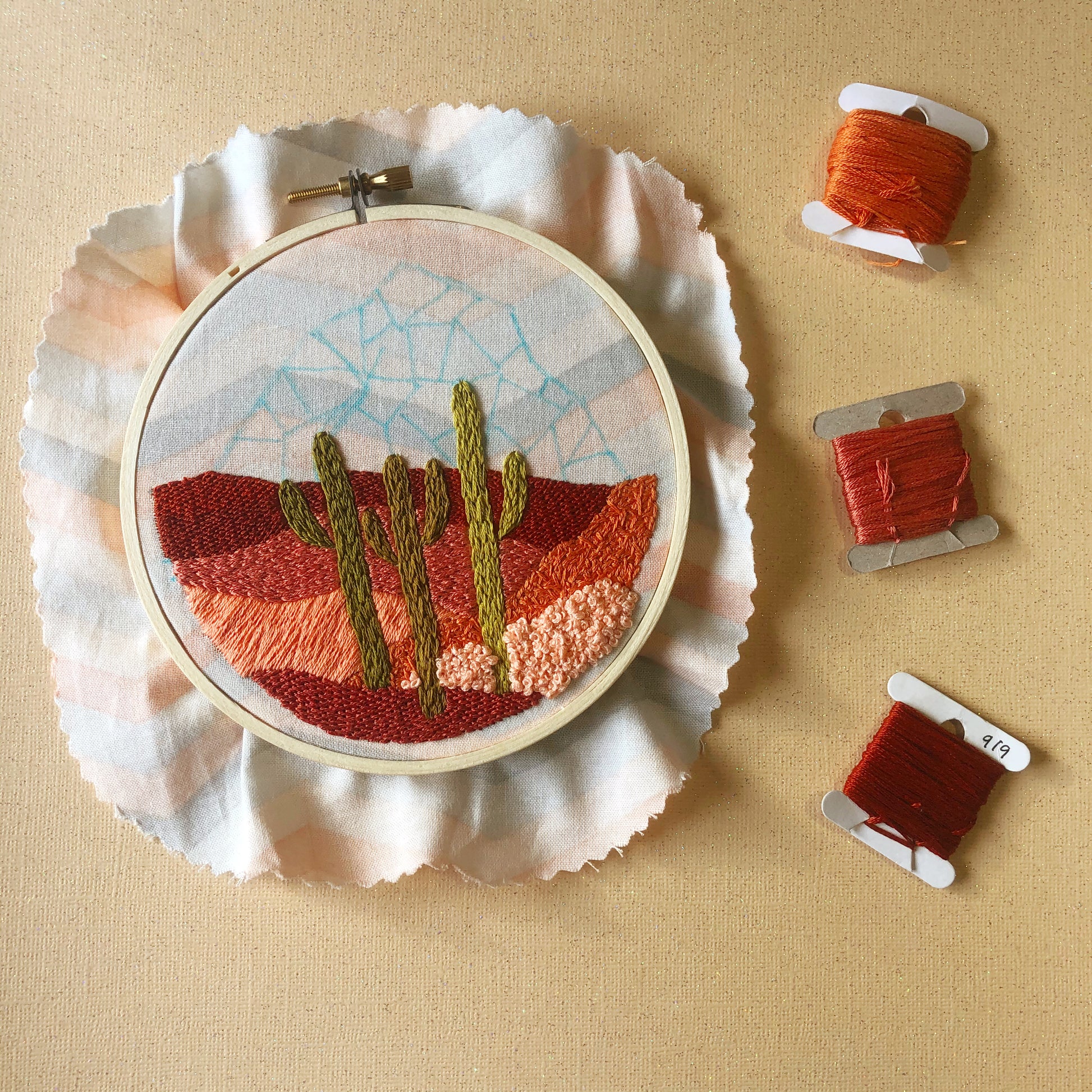 Inspired by a trip to Joshua Tree that didn't quite happen this April, this design combines the use of basic embroidery stitches to create a beautiful desert cactus landscape. This hand embroidery pattern is great for stitchers of all skill levels and the kit is designed with beginners in mind. The instructions detail how to place fabric in a hoop, split thread, and knot the thread as well as photo and detailed written instructions for the 7 different embroidery stitches used to create this design.