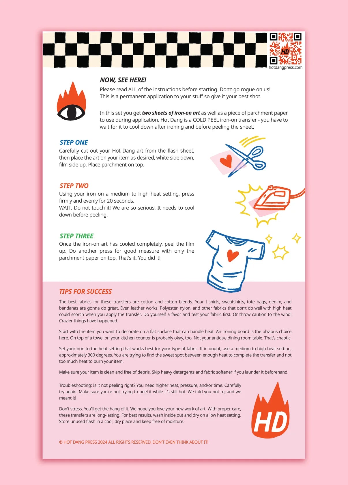 Each set includes two sheets of the displayed illustrations, heat protective parchment paper for application, and easy peasy instructions. You bring the heat! All you need is an iron.
