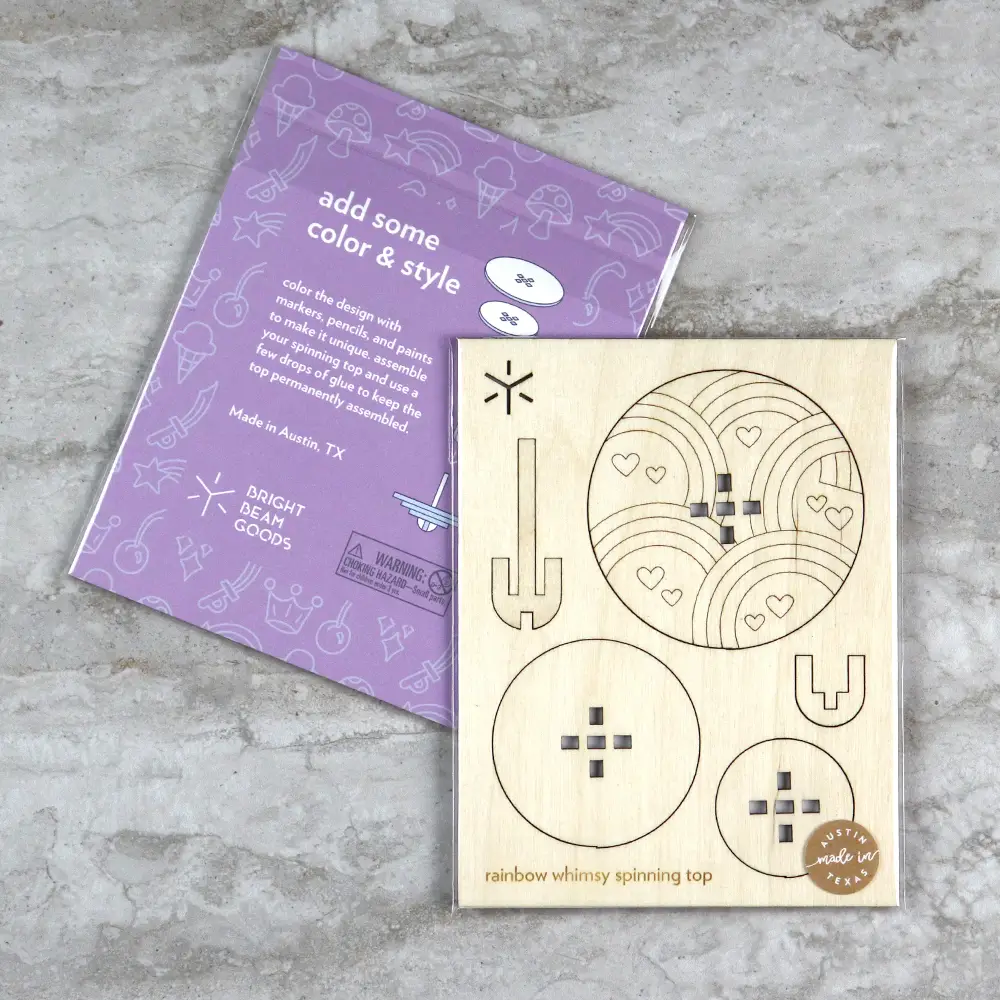 Assemble the baltic birch pieces to make your own spin top. Use markers, highlighters, or colored pencils to add some color and style to your top. Add just a touch of glue to hold the top together permanently and to ensure the steadiest spin. Instructions for assembling the top are included in the clear packaging sleeve