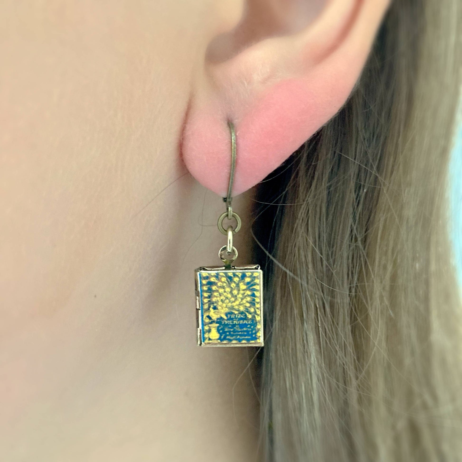 Our new book locket earrings are made with nickel free materials and feature the most beloved classic and modern books! They are on lever back style backers and are sealed with a gloss finish for durability. Each little locket measures about 1/2 long and 3/8 wide and is a little less than 1 1/2 inch long while wearing them. They come sealed inside a clear cellophane bag and are labeled as lockets.