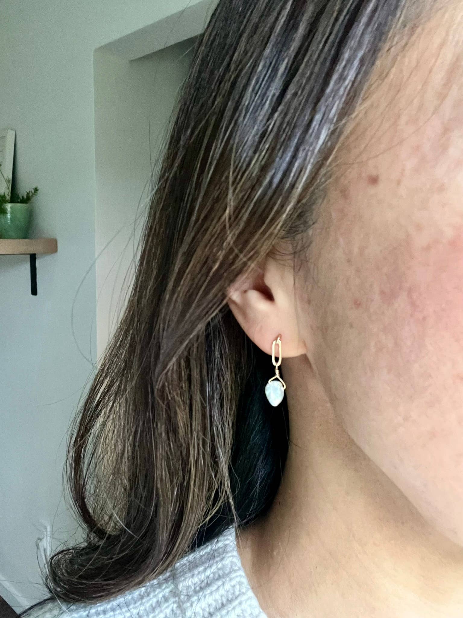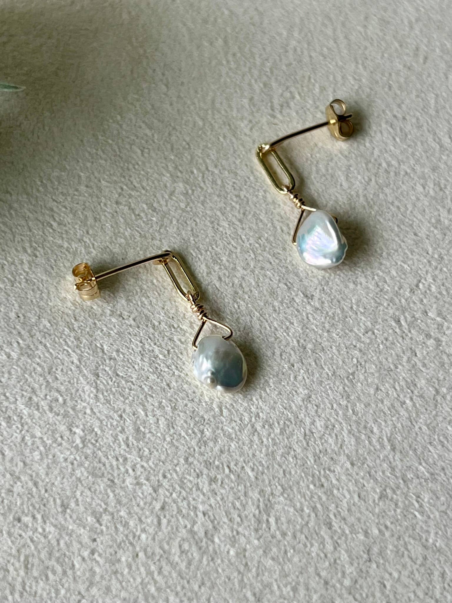 These minimalist stud earrings showcase an organic-shaped pearl that has been wrapped in 14k gold fill creating an elegant and timeless look. The length of the earring is approximately 3/4 inch.