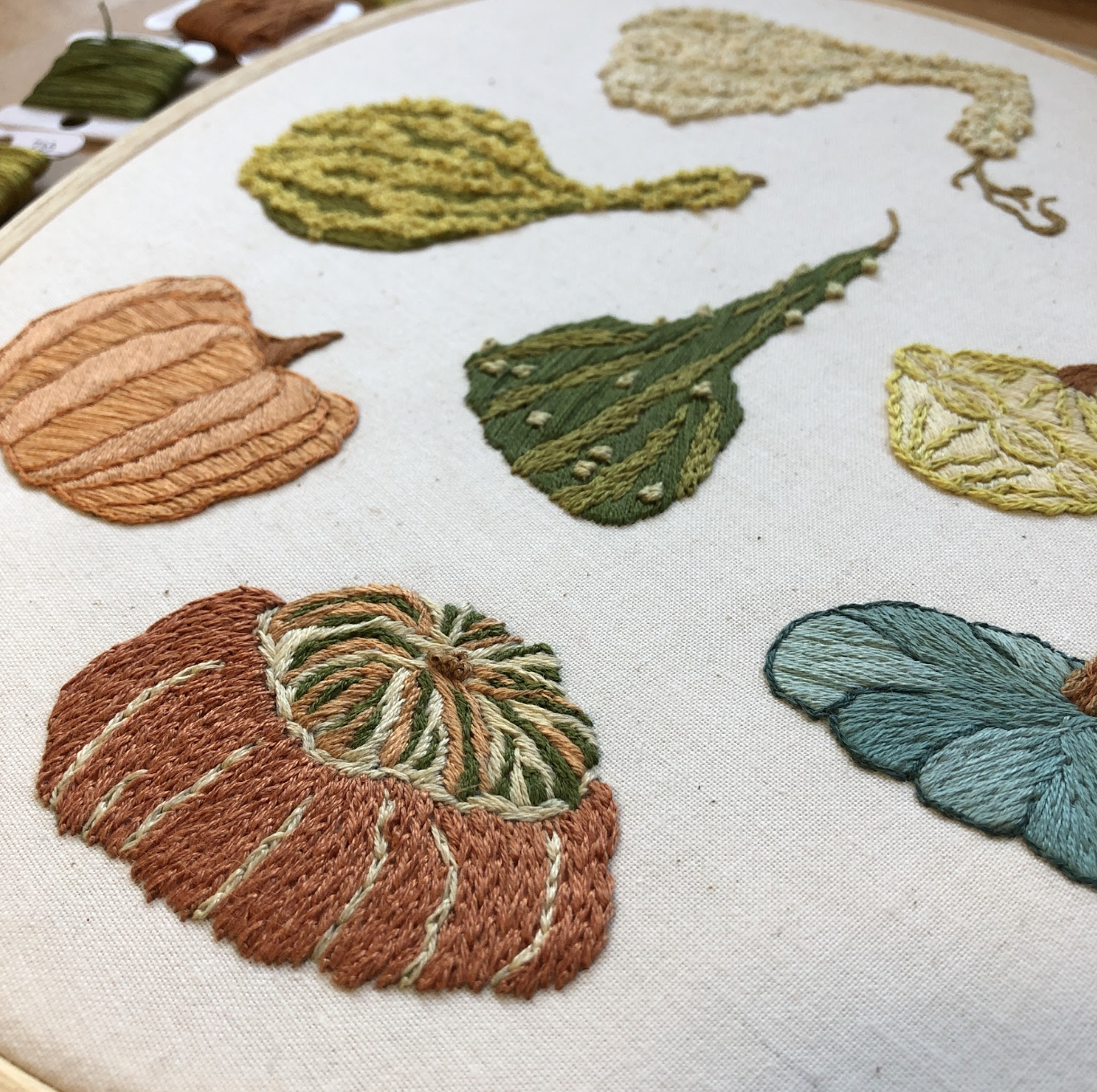 Want to learn how to create textural embroidery? Join Melissa Galbraith of MCreativeJ for a 2 hour, hands-on workshop. We’ll be stitching nobly, texture-filled gourds using the chain stitch, colonial knot, split stitch, and Danish knot. When you join this class, you’ll also receive a full kit that includes a beechwood embroidery hoop, cream cotton fabric, embroidery needle, full skeins of thread, gourd transfer patterns, backing materials, and printed instructions.