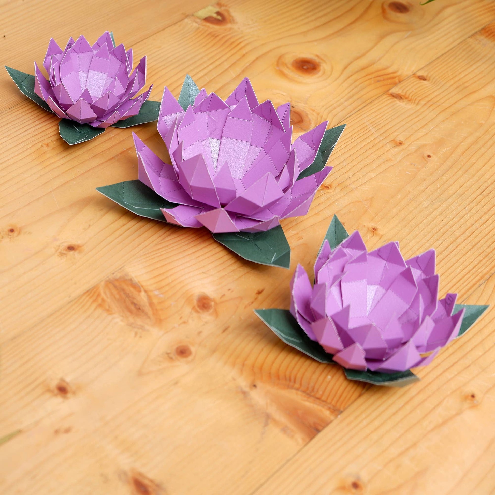 Unfold a world of wonder with this 3D lotus flower sculpted out of purple and green craft paper. Use the origami flower as a shelf ornament, table decoration or floral centerpiece.