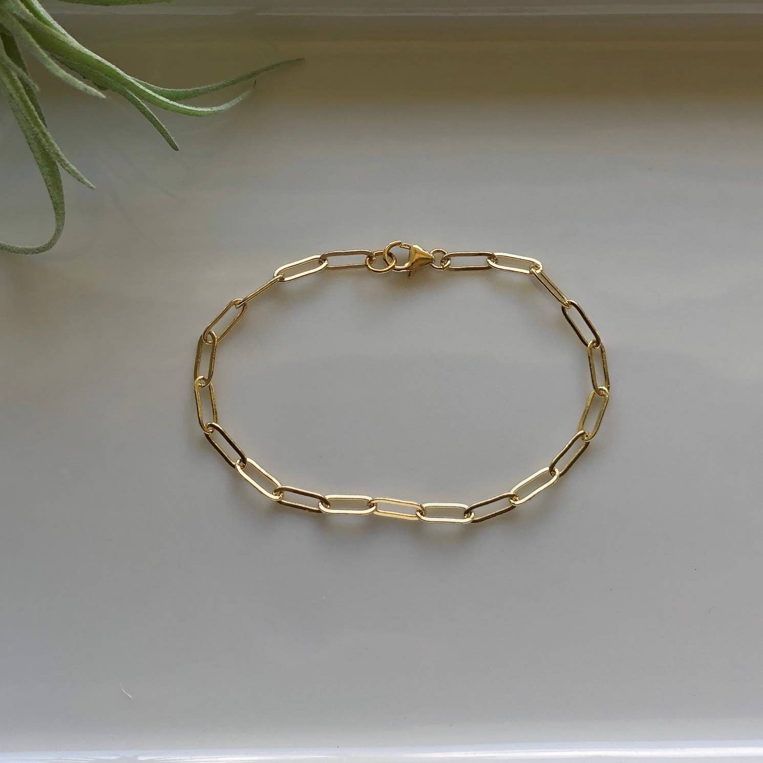 Paperclip Chain Bracelet / Rectangle Chain / Dainty Paperclip / Everyday bracelet / Gold Link / Layering / Gold Rectangle / Gifts for Her This 14K gold-filled Link Chain Bracelet is a versatile and stylish accessory, with a sleek paper clip style chain. Made from high-quality 14K gold-filled material, it is both beautiful and durable. Perfect for layering or wearing solo, this lightweight and shimmering bracelet is sure to turn heads. The chain links are 9 mm x 3 mm (0.6 mm thick)