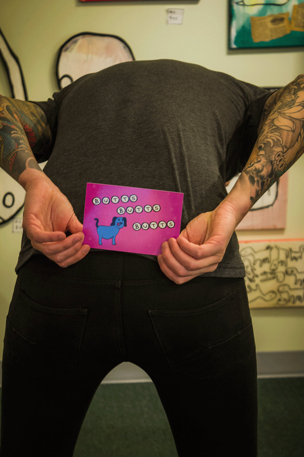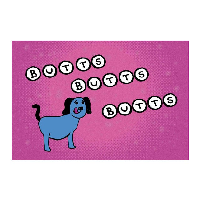 On the front it has a blue dog saying, "Butts Butts Butts"