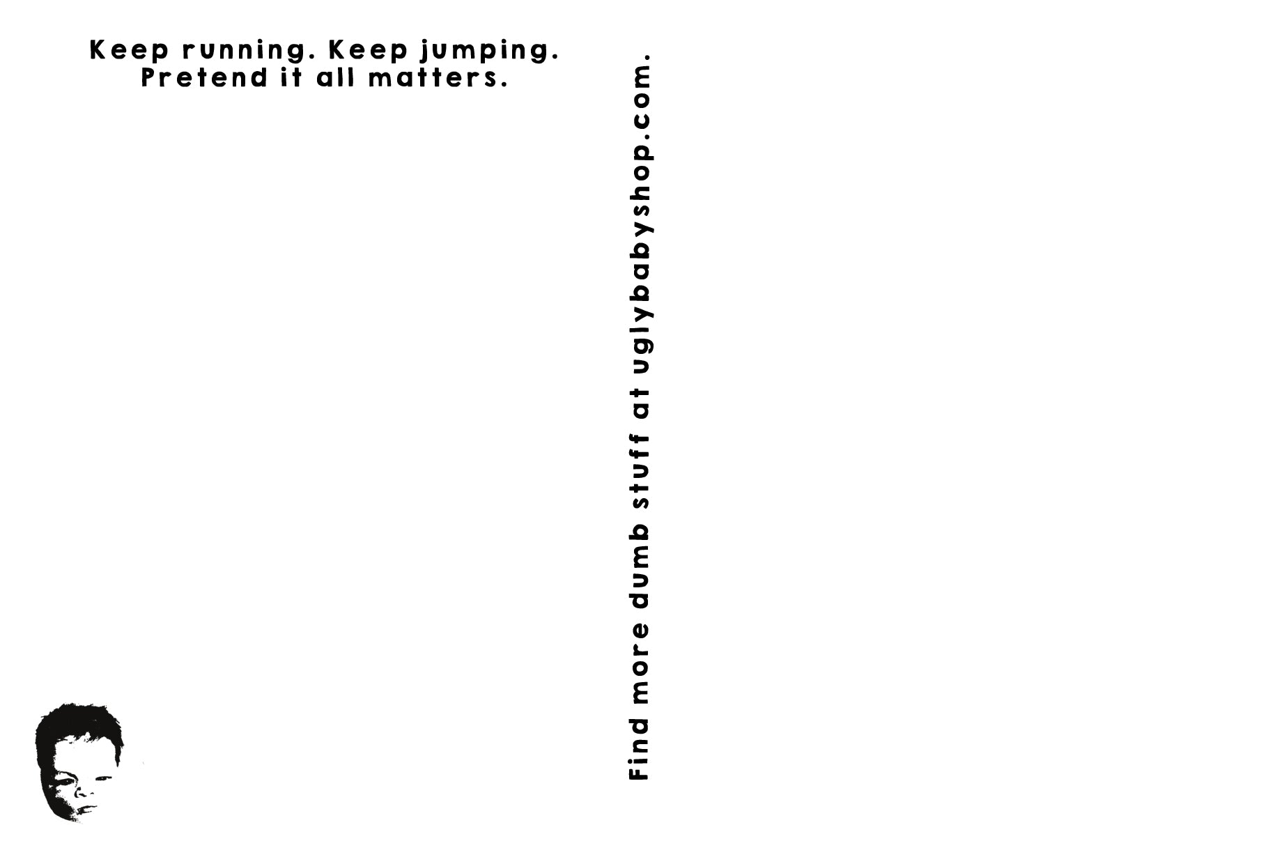 The back says, "Keep running. Keep jumping. Pretend it all matters."
