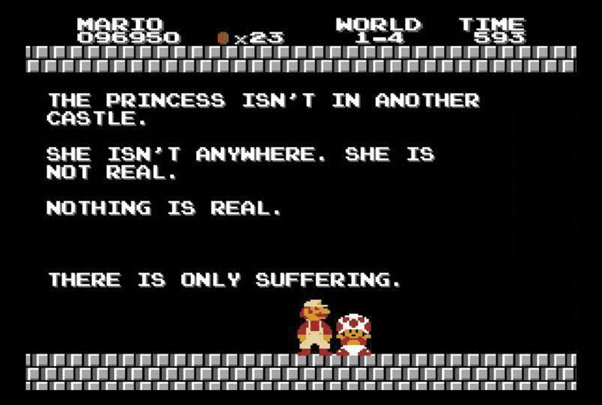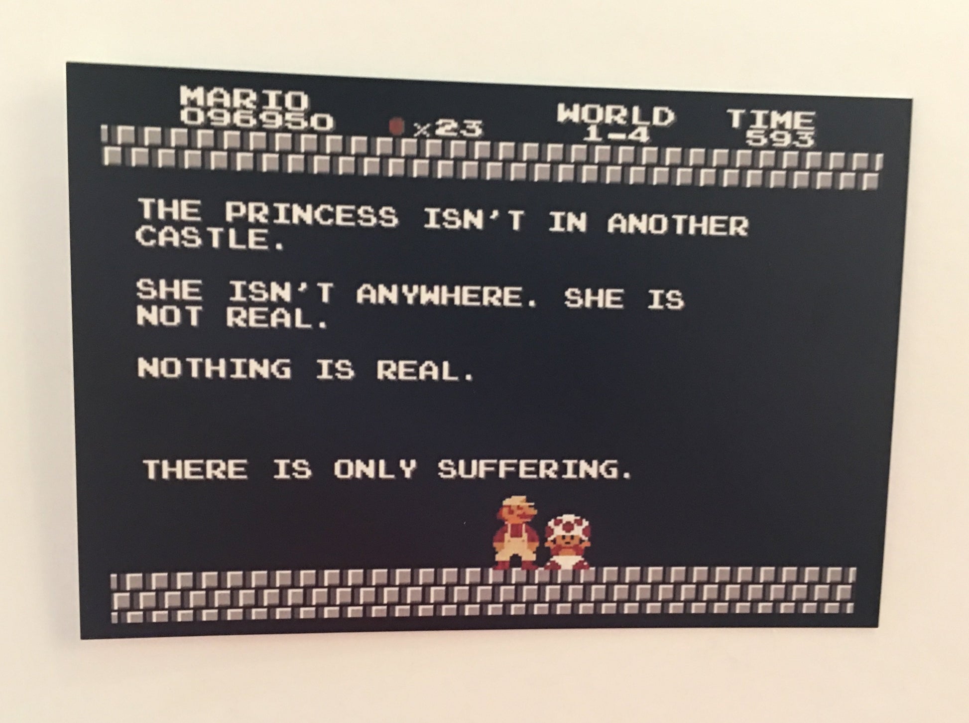 This 6" by 4" postcard says "The princess isn't in another castle. She isn't anywhere. She is not real. Nothing is real. There is only suffering." on the front.