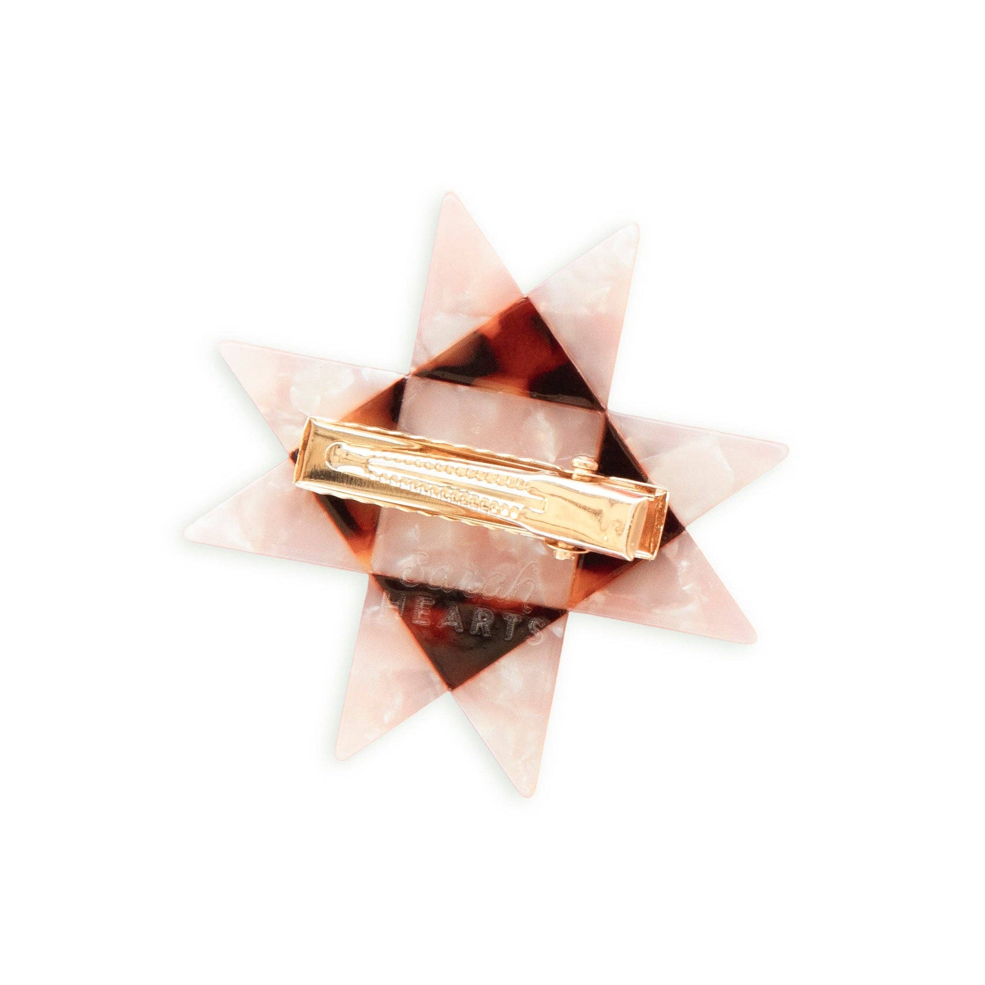 levate your hair game with our Quilt Star Hair Clip. The classic sawtooth star design, paired with a modern twist of brown and blush pink tortoise shell, will add a touch of sophistication to any outfit. Made from plant-based acetate and featuring a cream screen-printed design, this petite alligator clip is both stylish and eco-friendly. Secured with a gold alligator clip, it's the perfect accessory for any sewist. Details: 🌿 Made from eco-friendly plant-based acetate 🎨 Brown tortoise shell and iridescent white tortoise shell 📎 Gold alligator clip for secure hold