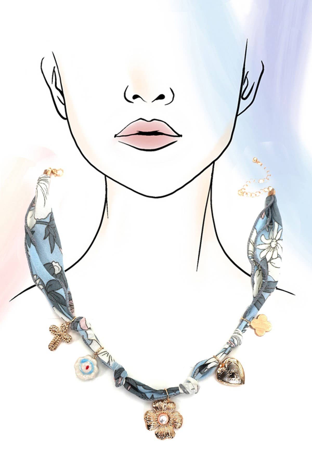 Bohemian charm in this Scarf Charm Necklace, featuring a soft knotted fabric adorned with meaningful and artistic details. Accented with a flower, cross, heart, and ceramic floral charms, it adds a layered, spiritual, and feminine touch to any outfit.