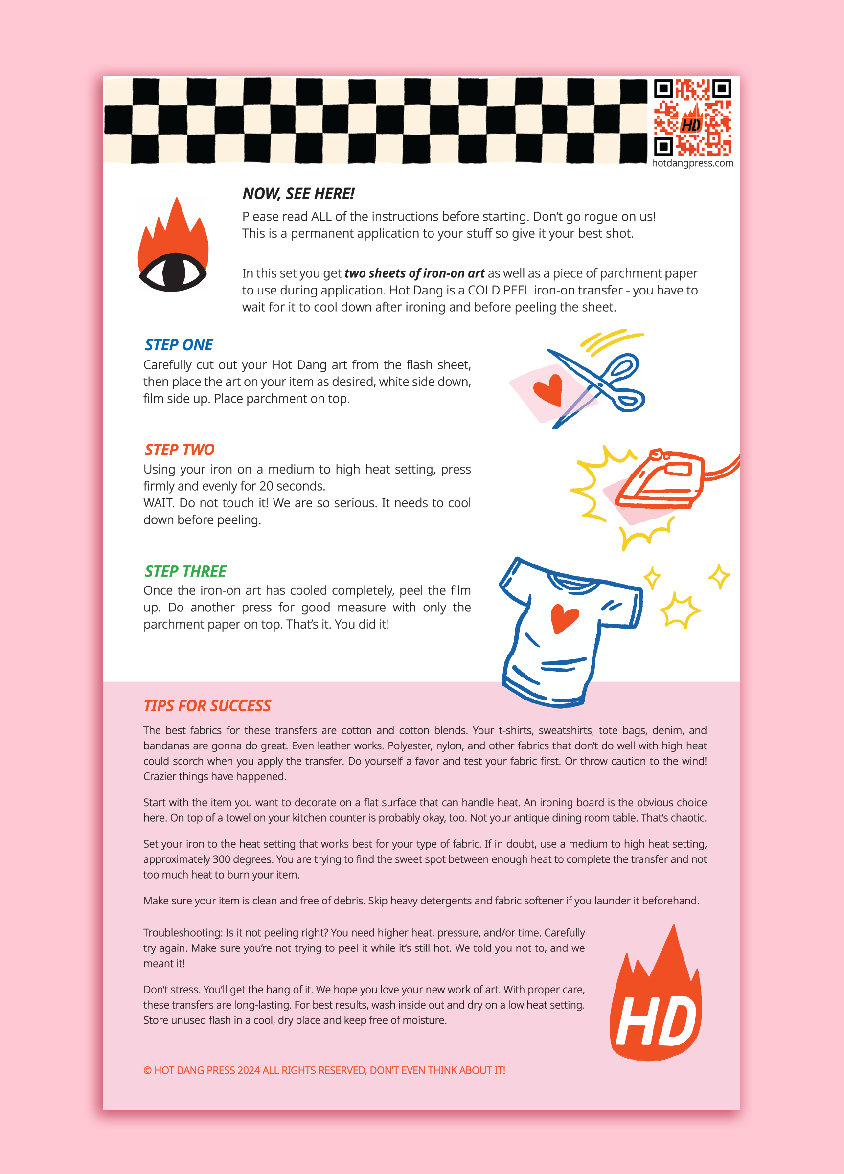 Each set includes two sheets of the displayed illustrations, heat protective parchment paper for application, and easy peasy instructions. You bring the heat! All you need is an iron.