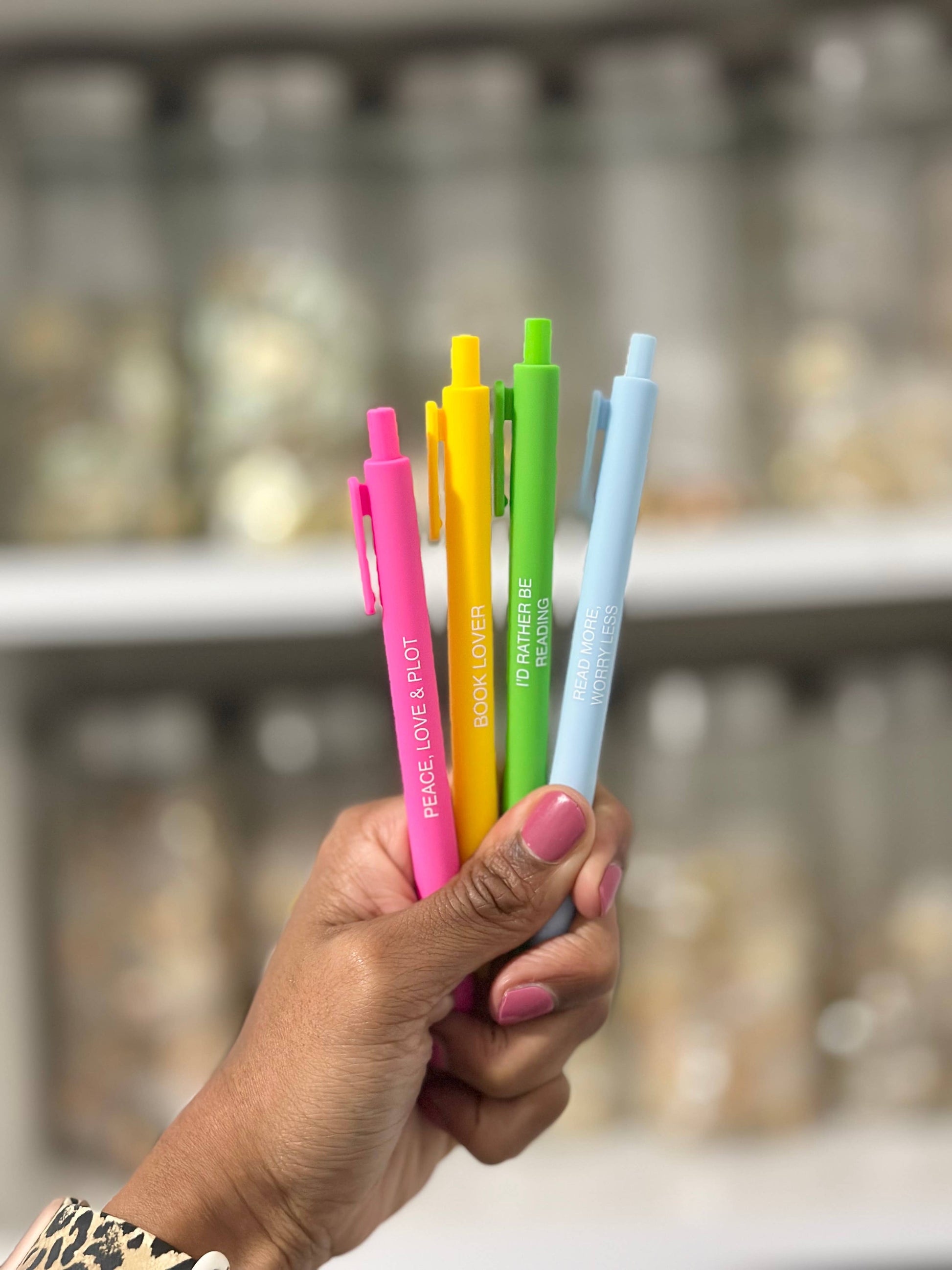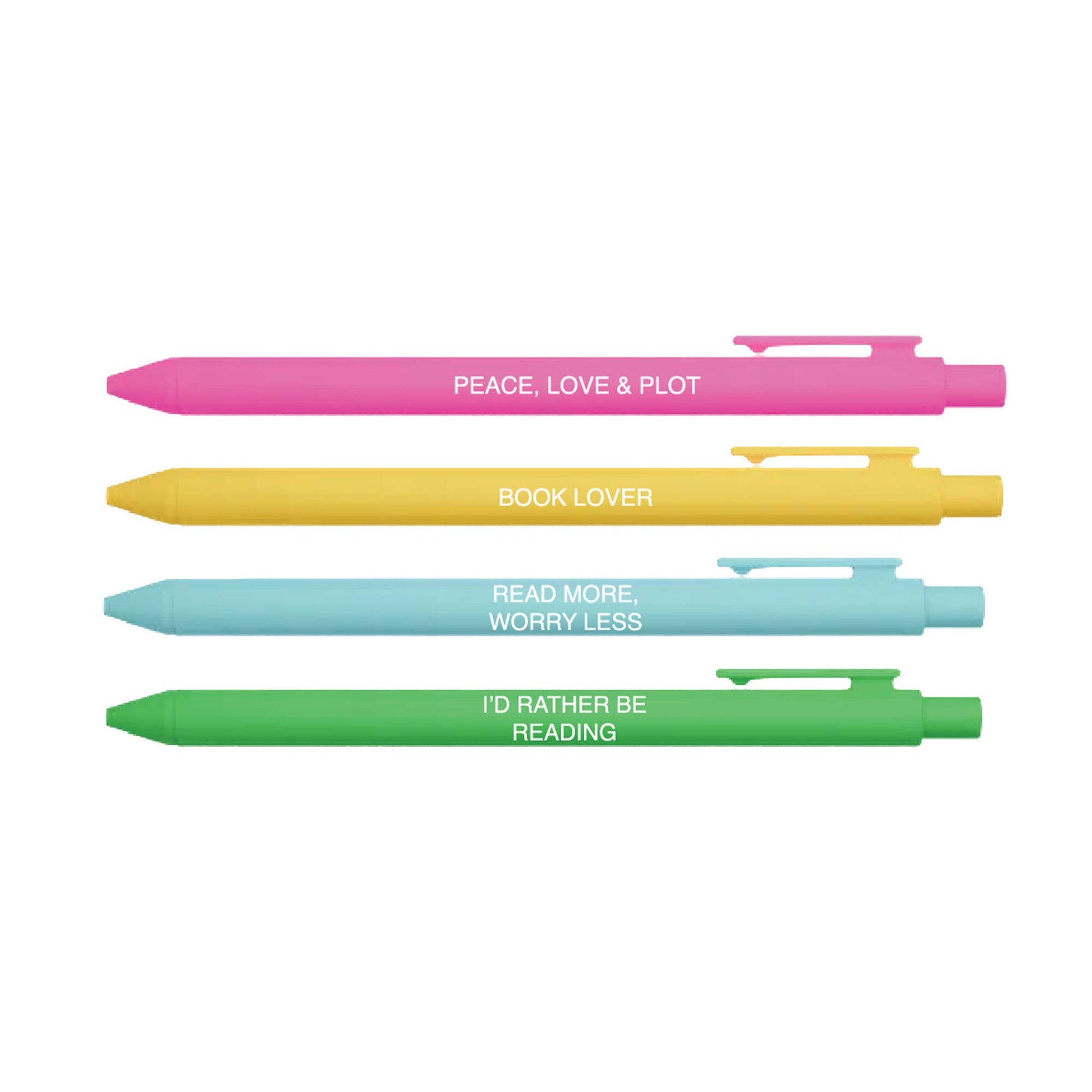 Each set includes four smooth black-ink ballpoint pens with bookish sayings that speak fluent reader:
