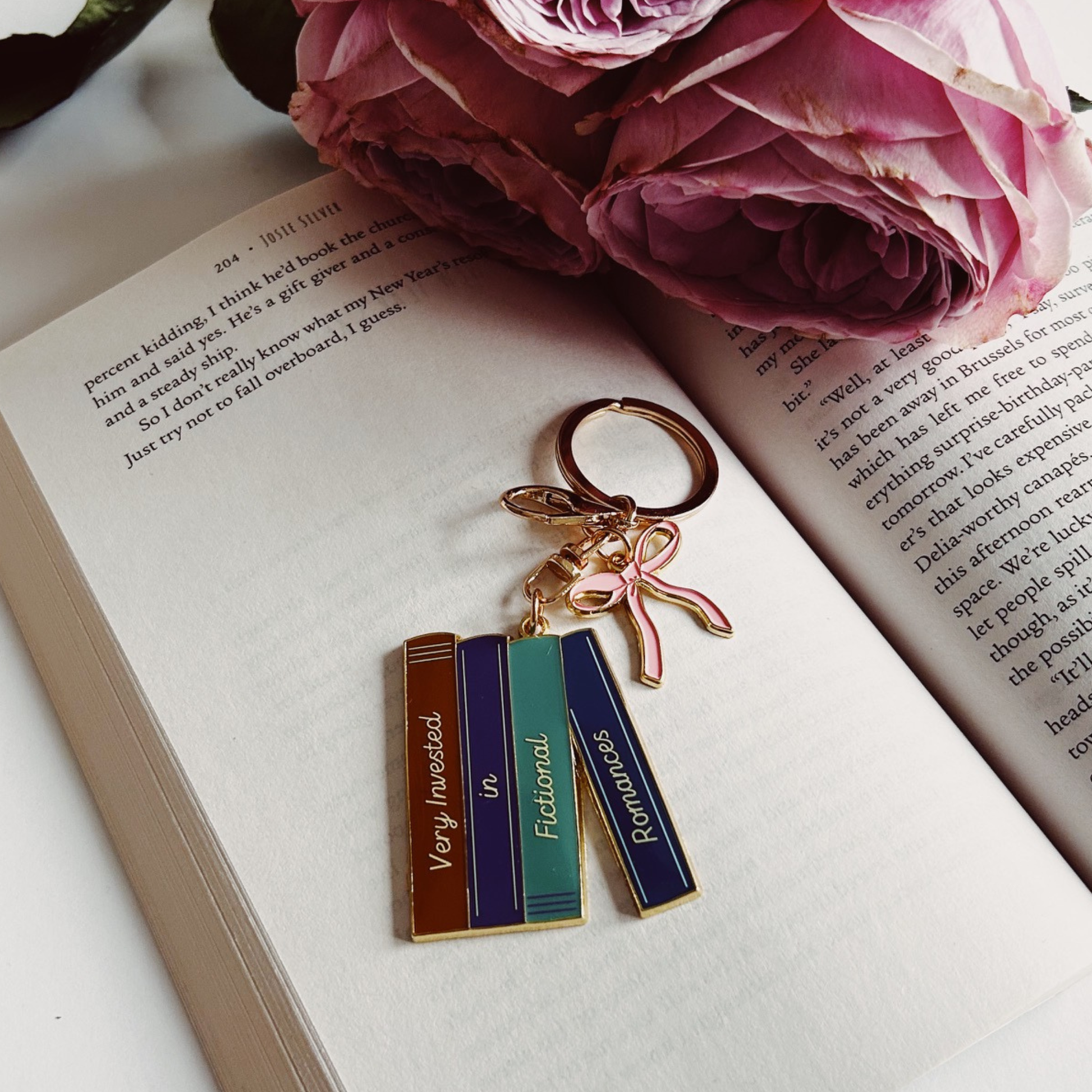 Key Features: * Material: Made from soft enamel for a durable and vibrant finish. * Size: Measures 2.0 in L x 1.8 in W. * Design: Features a stack of books with the phrase “Very Invested in Fictional Romances” and a pink bow charm. * Hardware: Includes a sturdy key ring and lobster claw clasp for secure attachment.