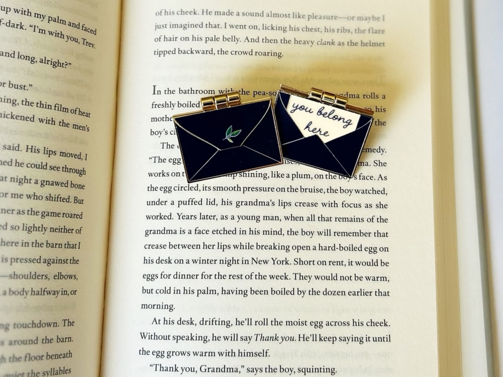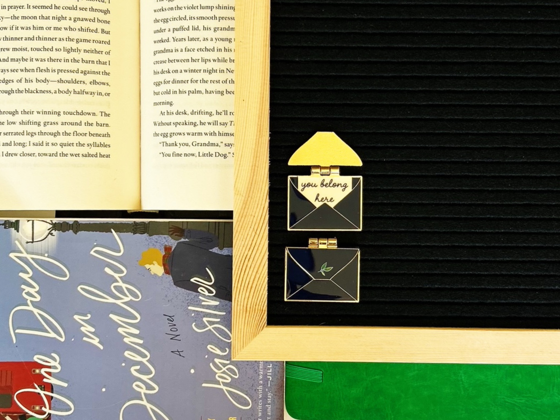 ✨ Key Features Material: Durable soft enamel with fine detailing Dimensions: 1.1 in x 1.5 in Design: Hinged envelope in navy with a green leaf, opens to reveal “You Belong Here” message Versatile Display: Wear it on tote bags, denim jackets, backpacks, hats, or keep it close on a pinboard
